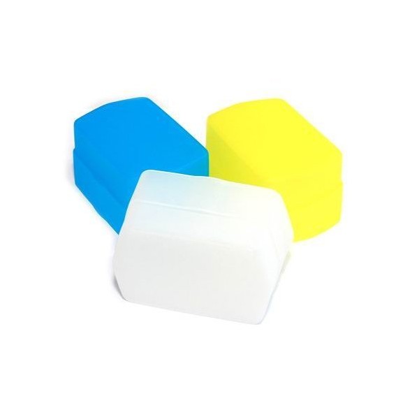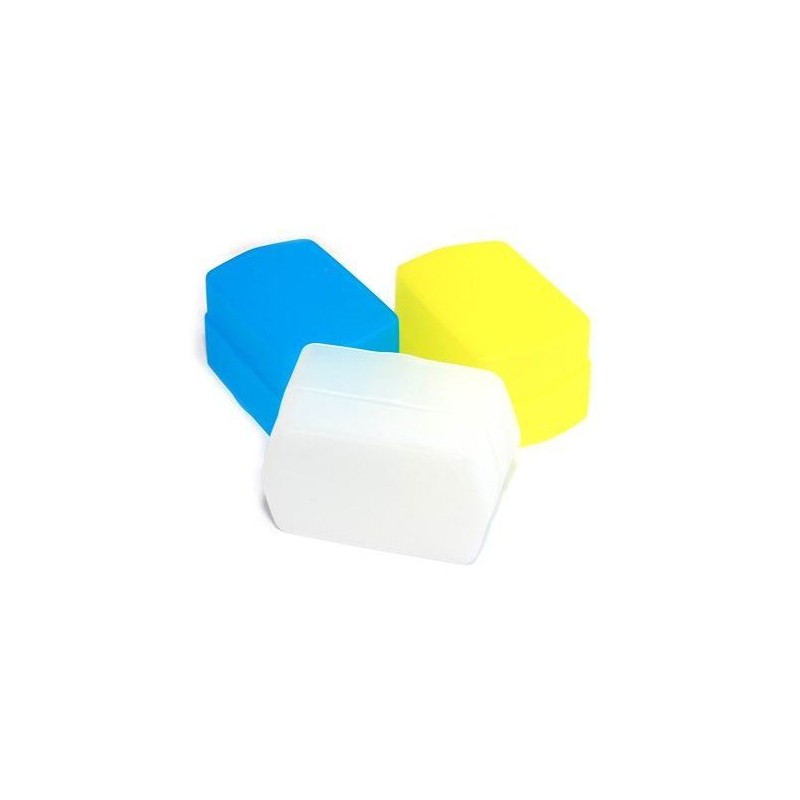 The white diffuser improves the picture quality of use a dedicated flashgun through better distribution of light and a soft, even illumination. Also it helps prevent reflections and makes background shade. The yellow diffuser is perfect for portrait recordings, it creates a warm illumination and natural looking skin tone. The blue diffuser reduces the yellow tone in photos with artificial light.