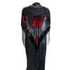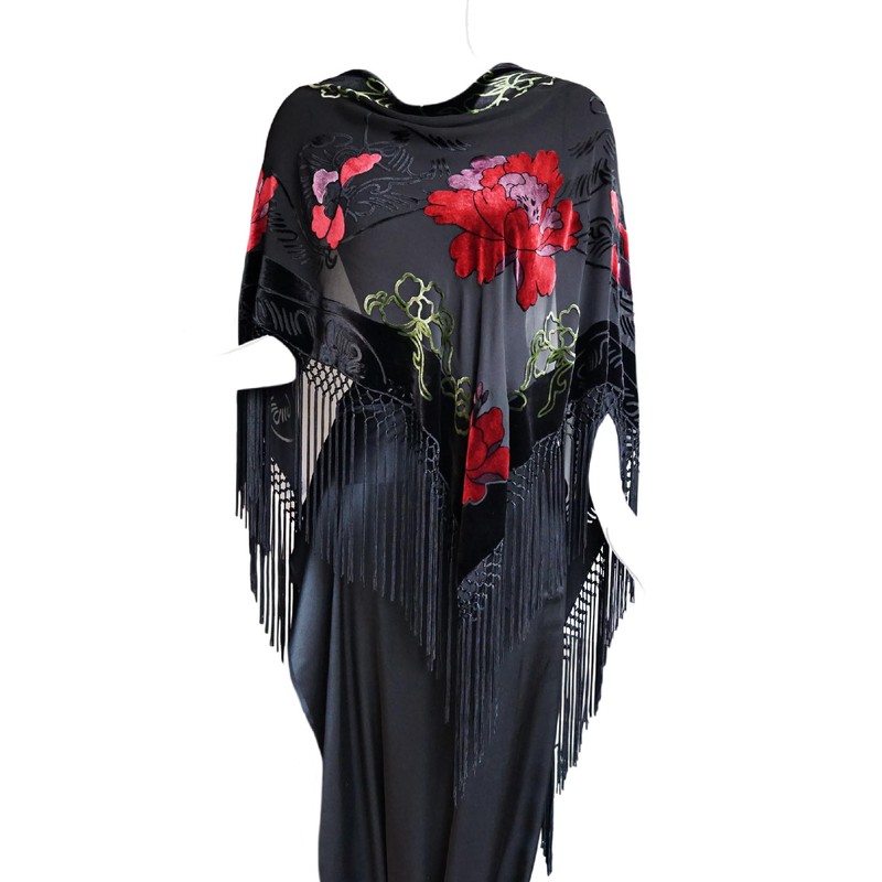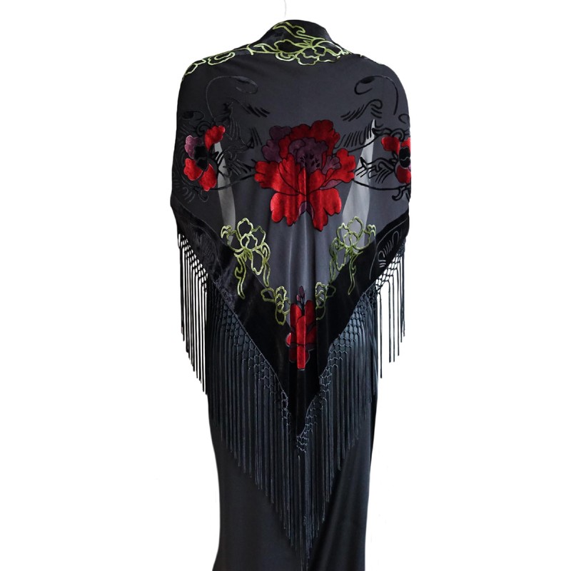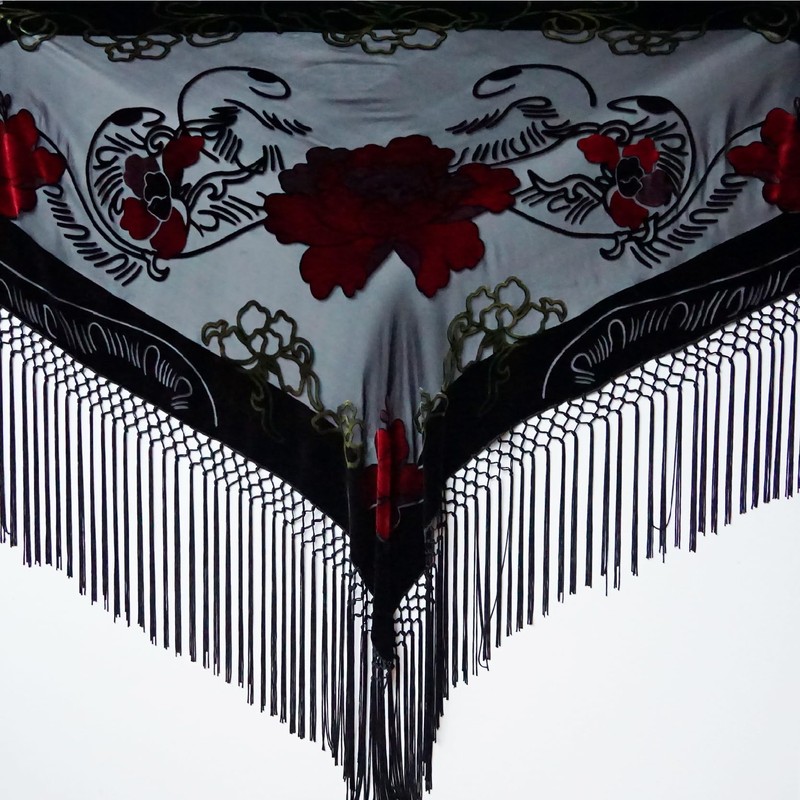 JJcollection Silk Base Burn-out Velvet Triangle Scarf, with 8" Tassel on two sides, Flora pattern, Black and Red Color