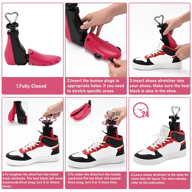 - MULTI-WAY ADJUSTABLE DESIGN - The adjustable shoe last stretcher rotates the top black rotation shaft to increase the width of the shoe tree foot, and rotates the bottom black rotation shaft to extend the length of the shoe tree. The shoe stretcher adjusts ill-fitting shoes to fit you by providing enough light tension to relieve plantar fasciitis, bunion socks, blisters, sore toes and many other bad problems, so your feet Always comfortable.