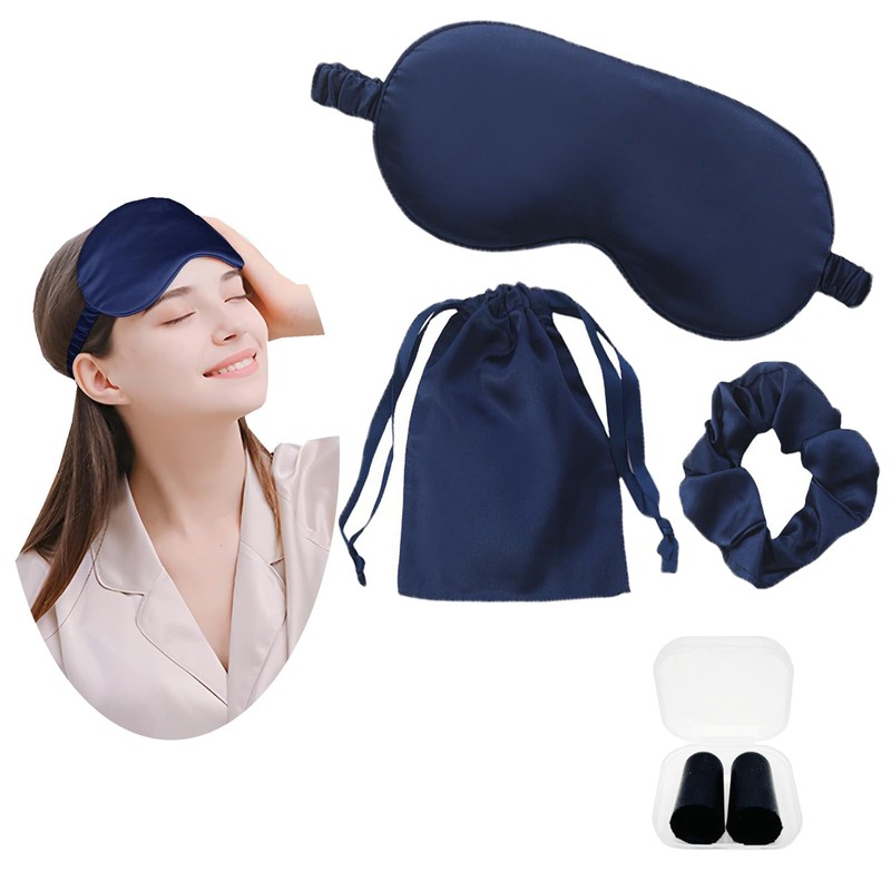 JK Home JK Home Silk Eye Mask Travel Set with Pouch Earplug and Hair Scrunchies, Satin Sleep Mask Soft Eye Cover Eyemask for Women Men Blackout with Elastic Strap for Night Travel Nap Navyblue