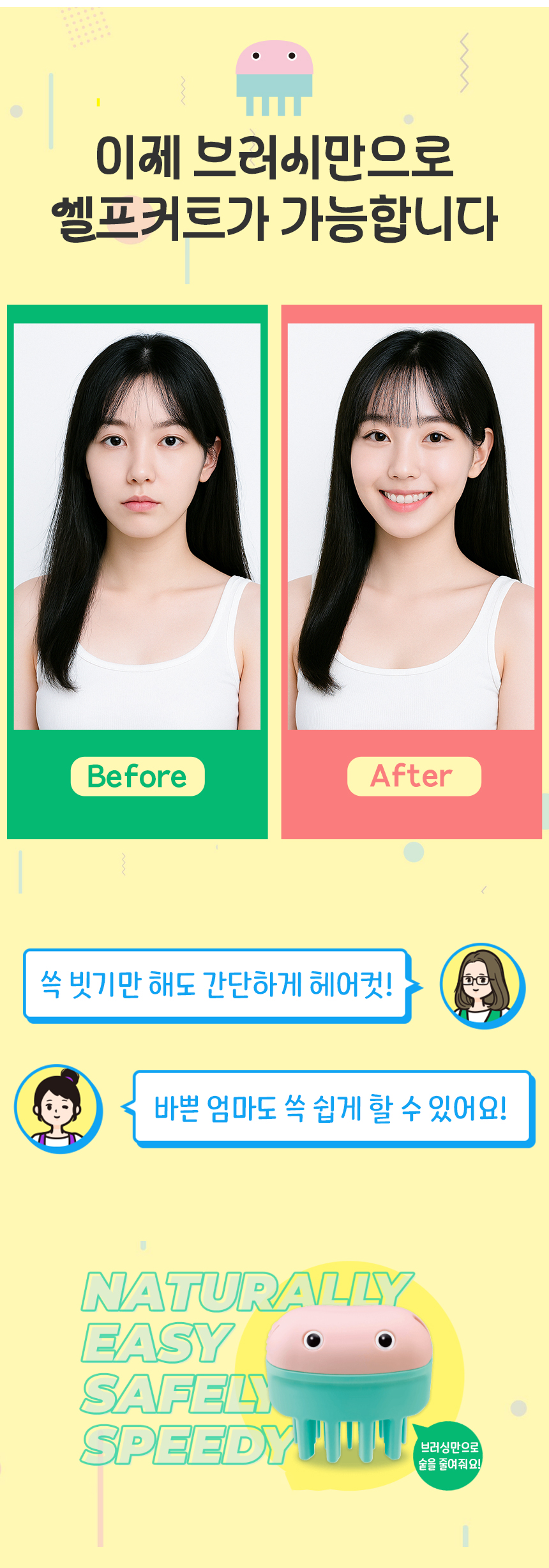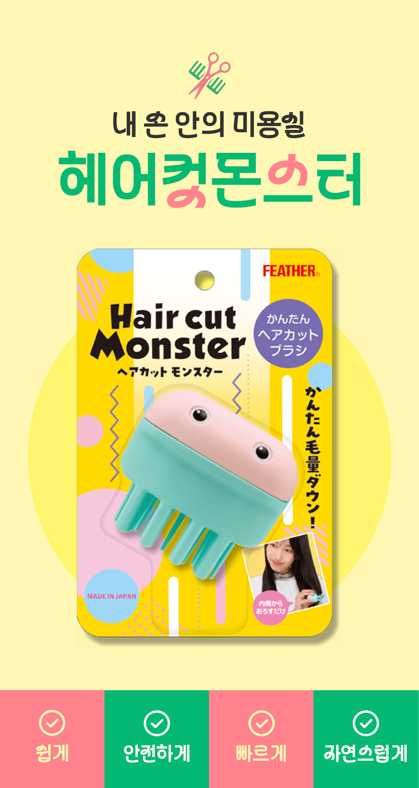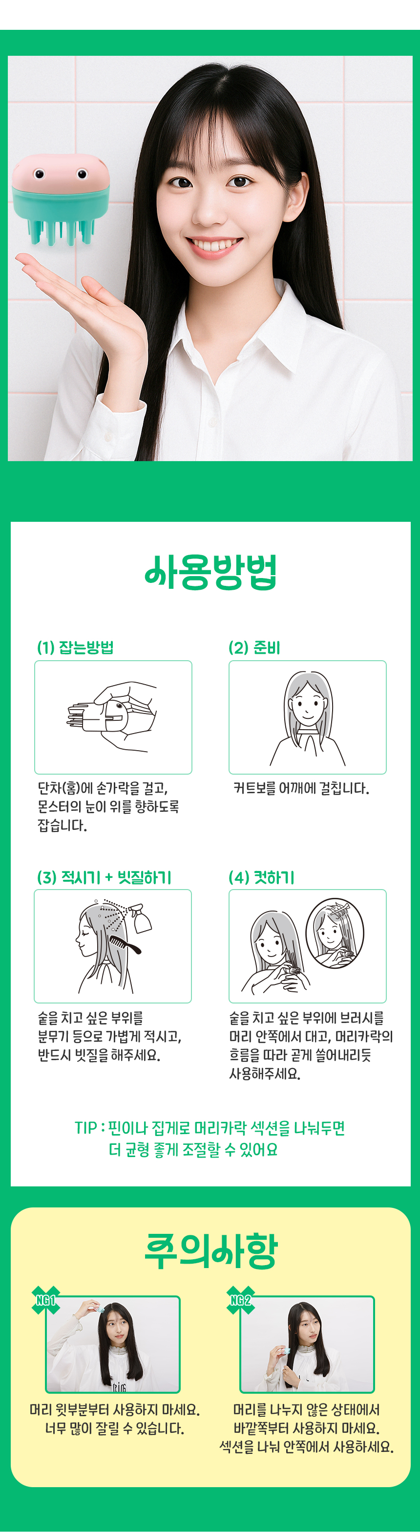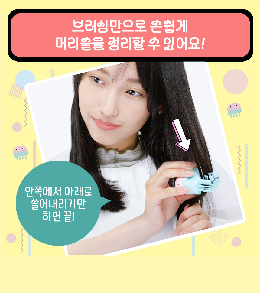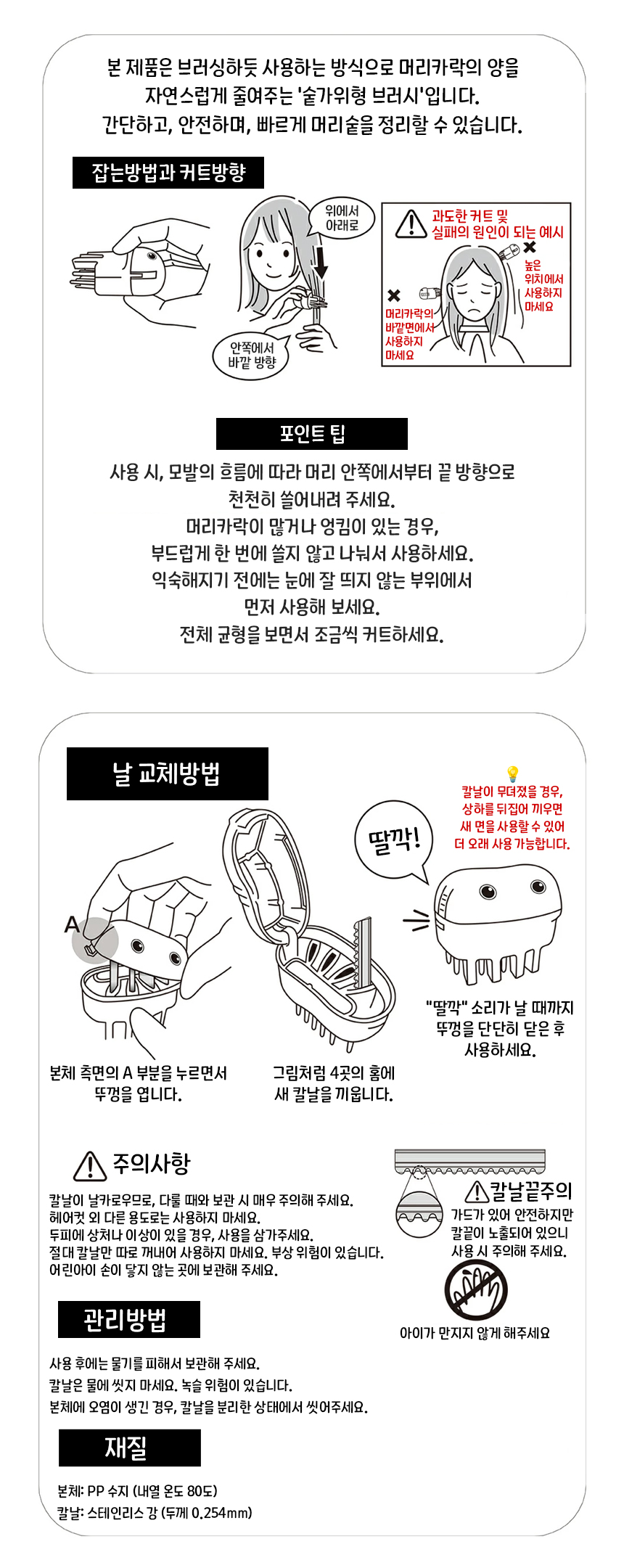 일반적인 가위나 클리퍼와는 다르게 브러시 형태로 머리카락을 쓸어내리면서 숱을 일부만 잘라내는 구조입니다.