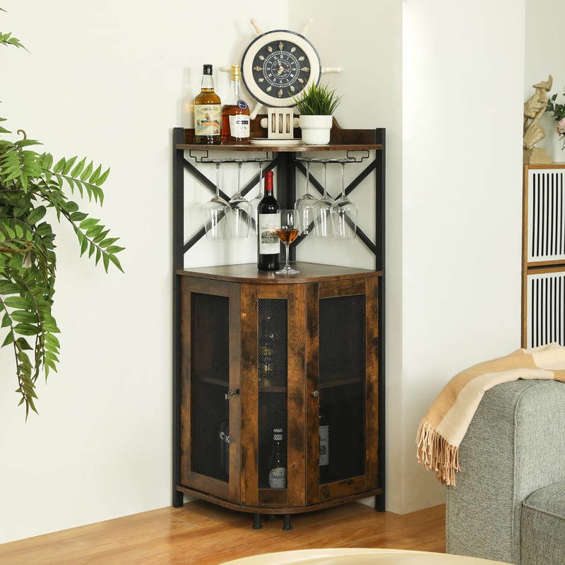 JKsmart Corner Bar Cabinet with Glass Holder,Industrial Wine Cabinet with Mesh Door,4-Tier Wine Cabinet with Open Shelf,Farmhouse Home Bar for Liquor and Wine Storage,Rustic Brown
