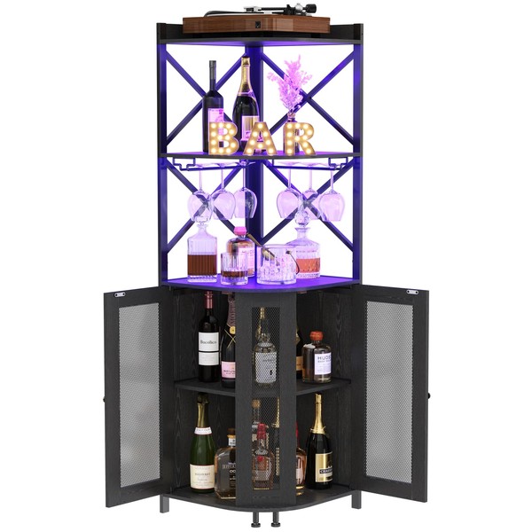 - 【Smart LED Lights Home Bar】Our corner tall liquor cabinet comes with two LED lights, it has 7 main colors, 20 static modes and 22 flashing modes. Also we will give you a remote control that can control the LED lights, you can remotely control the light strip to create a wonderful atmosphere for you and bring a chic feeling to your home!