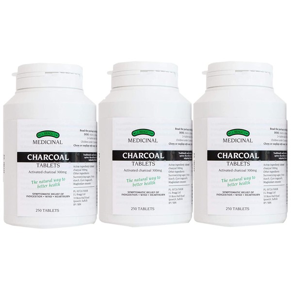 Product DescriptionJ.L bragg's medicinal charcoal tablets provides 100% natural food supplement for digestive relief. Used for the treatment of indigestion, bloating, gas, wind, flatulence, dyspepsia. Take a pack on holiday to protect against the effects of an upset stomach. Bragg's is the only UK manufacturer of medicinal activated charcoal tablets. Our activated charcoal is produced from coconut shells and has been purified for use as a pharmaceutical active ingredient. High potency and high absorbency. Produced from natural ingredients with no artificial additives. Wheat and lactose free. Can be used during pregnancy and lactation.IngredientsActivated charcoal powder BPC1934 at 300mg per tabletDirectionsStore in cool dry place out of the reach of childrenSafety WarningIf taking prescribed medication consult with Pharmacist or General Practitioner
