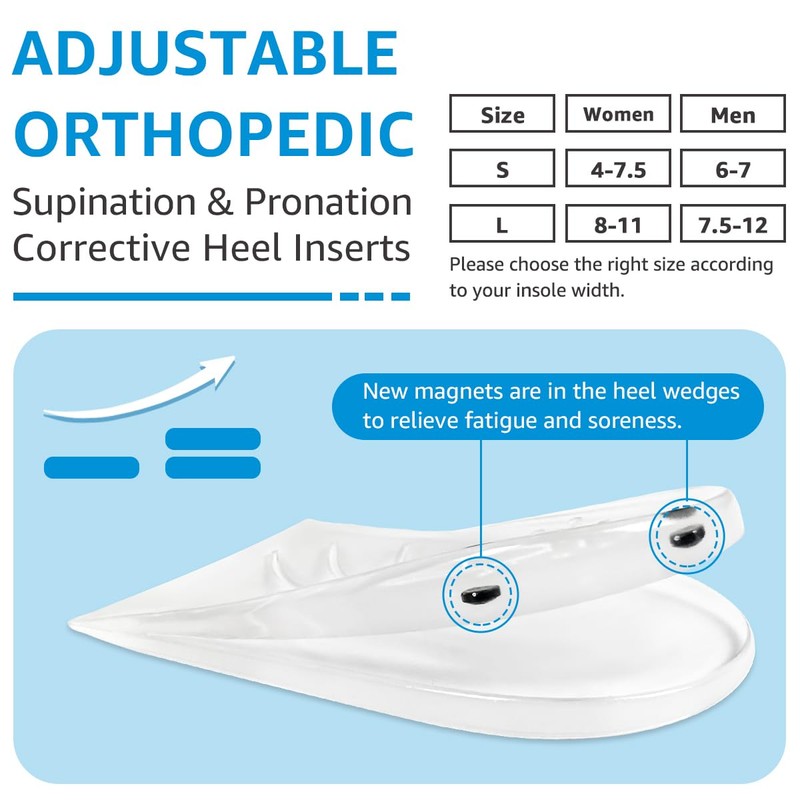 - For Over Supination: If over-supination is bothering you, you could use JL-Group 2 Layers Adjustable Heel Wedge Corrective Inserts by applying the high thickness side to the heel of the shoe on the outside of your legs. Use 1 or 2 layers depending on your degree of over supination. This corrective heel wedges insoles will help to correct the problem of over supination of the heel and provide fixed support to the internally rotated heel, improving the posture of the legs, as well as the walking posture. Helps relieve ankle pain, knee pain, hip pain, low back pain due to incorrect leg posture.