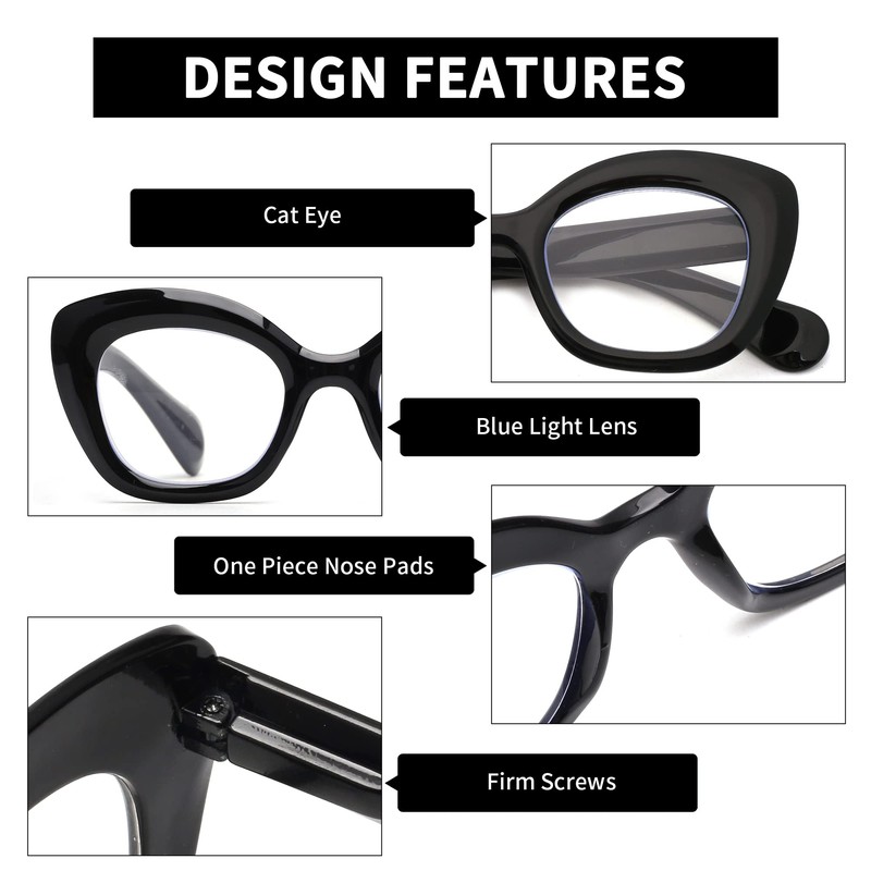 - Produkteigenschaft – Übergroßer, langlebiger, hochwertiger Cat-Eye-Rahmen, vergrößernde Blaulicht-Blockierlinse, Sattelbrücke und Metallscharnier.