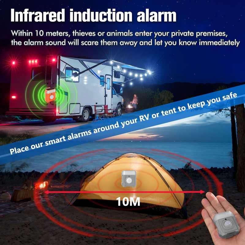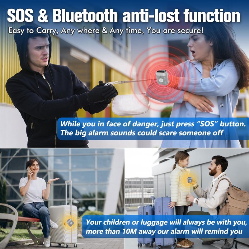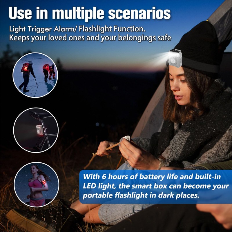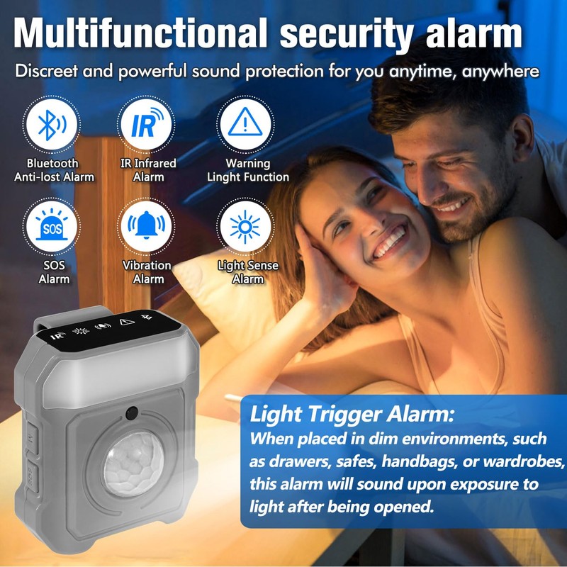- Versatile Security for Various Scenarios: Protect yourself and your belongings wherever you are. The infrared alarm safeguards campers by detecting intruders near tents, while the light-sensing mode protects valuables in hotels. The vibration alarm adds security to your travels, and the warning light improves nighttime visibility. With Bluetooth anti-lost and an emergency SOS feature, you'll have peace of mind in any situation.