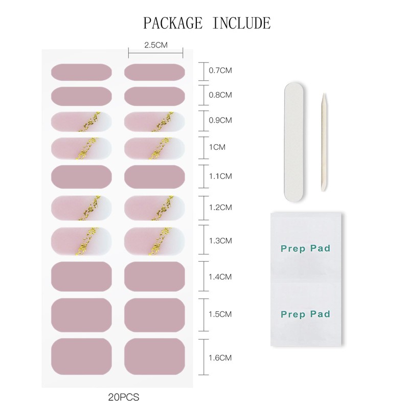 - Package Contains: 20 Polish Nail Strips, 2 Cleaning Wipes, 1 Wood Stick, 1 Nail File