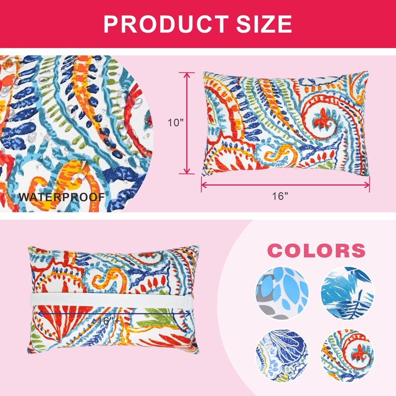 JMGBird Outdoor Pillow for Chaise Lounge Chair Set of 2 Waterproof Headrest Pillow Lumbar Pillows with Insert & Adjustable Elastic Strap for Beach Poolside Patio Office, 10x16 Inch