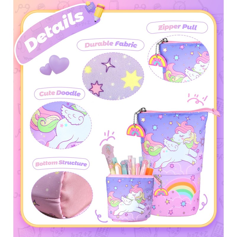 JMHACHY Standing Pencil Case for Kids - Back to School Stuff, Unicorn Telescopic Zipper Pencil Case Aesthetic, Large Capacity Stand up Pen Bag, Portable Pen Holder, Study Supplies for Students