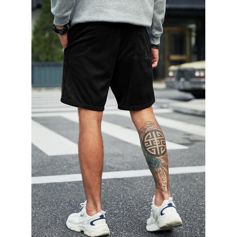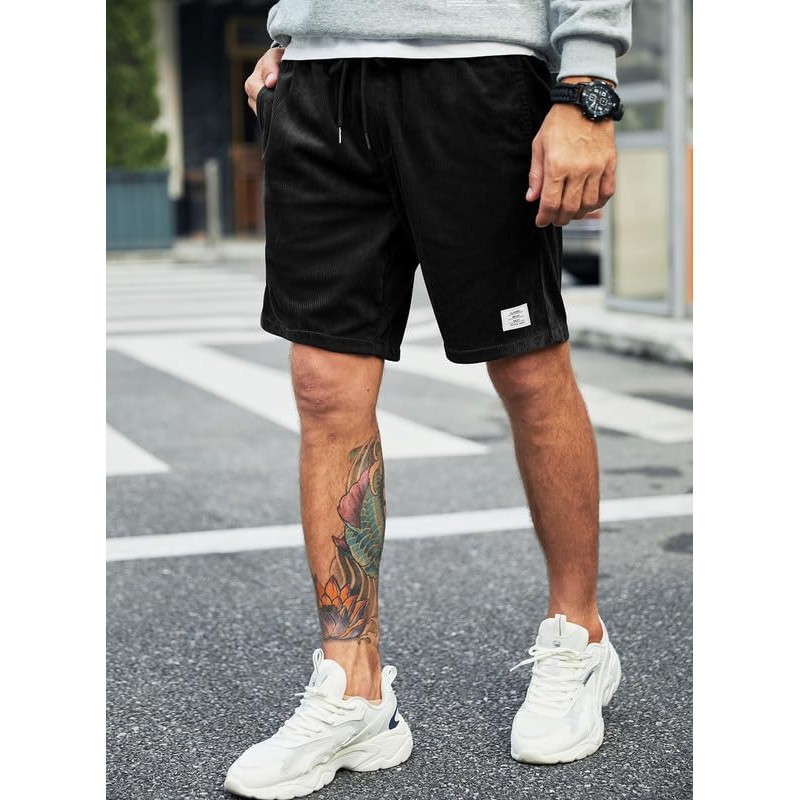 JMIERR Corduroy Men's Shorts with Pockets Summer Casual Shorts Elastic Waist Loose Beach Shorts, A Black