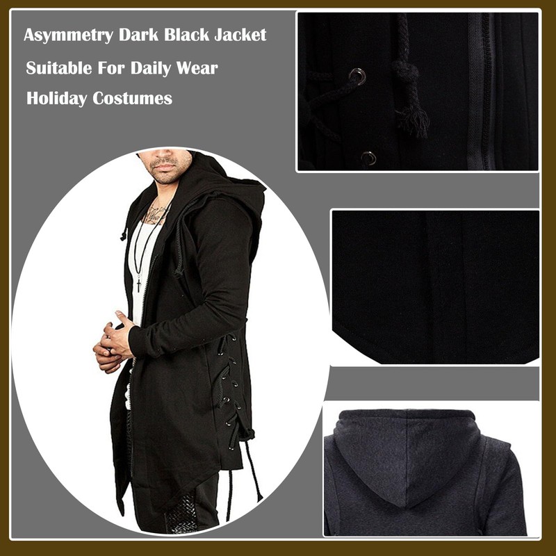 JMSUN Men Assassin Robe Hoodies Sweatshirts Gothic Asymmetrical Zipper Side Lace Up Fleece Hooded Jacket Black