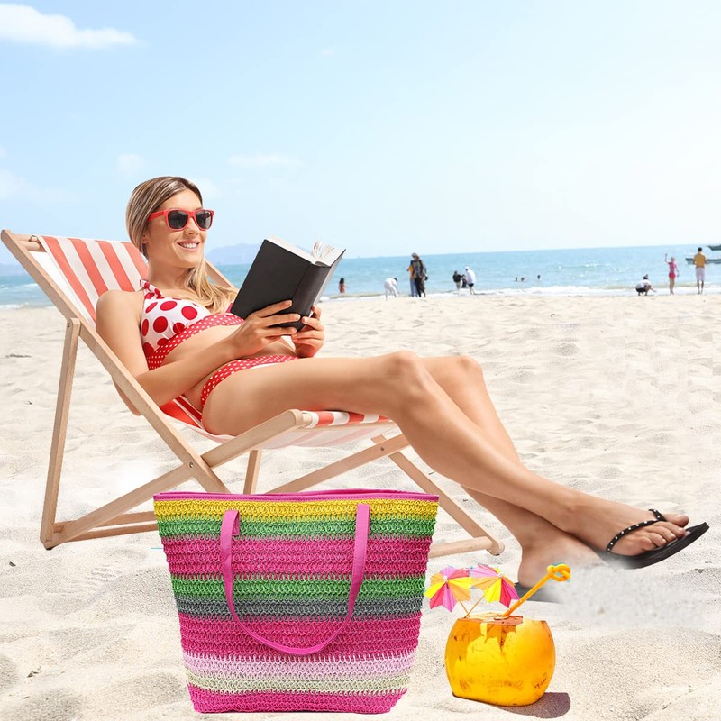 JNF Large Colorful Beach Bags for Women Straw Beach Tote bag Rattan Woven Crochet Beach Bags Boho Beach Towels Bag Set, Straw Beach Bag Hot Pink, 3X-Large