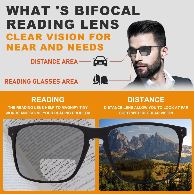 - 【SOLID MATERIAL & METAL SPRING HINGE】- Made with high-quality CP frame and metal spring hinge that can swing outward by 15°, these bifocal sunglasses are flexible, durable, suitable for both men and women as a fashionable accessory for daily wear. Rest assured that all accessories and materials do not contain harmful substances such as lead or bisphenol A."