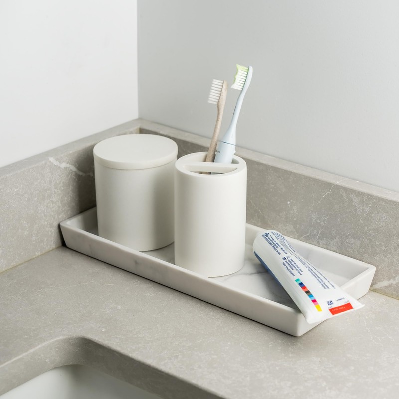 JO LAVIE White Toothbrush Holder for Bathrooms – Modern Resin Countertop Organizer with Slots, Compact Toothbrush and Toothpaste Storage for Vanity, Hotel, Airbnb (White)