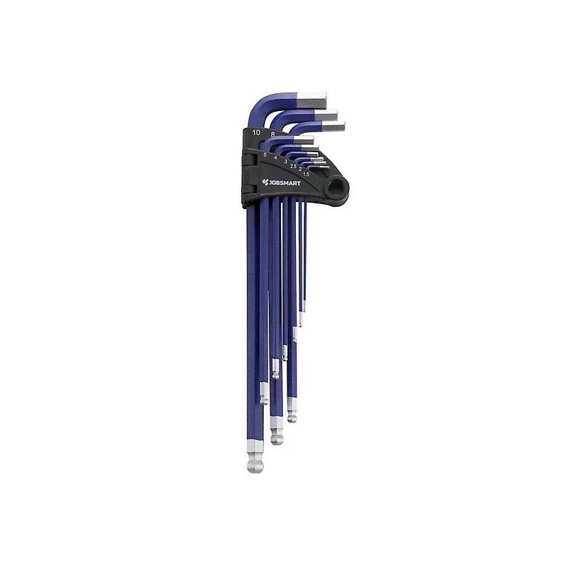 The 9 Piece Extra Long Ball Point Hex Key Set Metric by jobsmart includes hex keys with a long arm and ball end. These tools are designed for use in various applications requiring metric measurements. Ideal for DIY projects, repairs, and maintenance tasks.