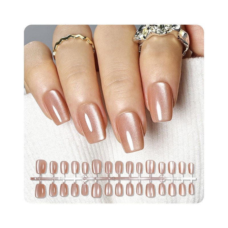 JODSONE 30PCS Nude Pink Cat Eye Press on Nails Set Acrylic Short Square Fake Nails Reusable Shimmer Magnetic soft Gel Glitter Nature Stick on Nails for Women