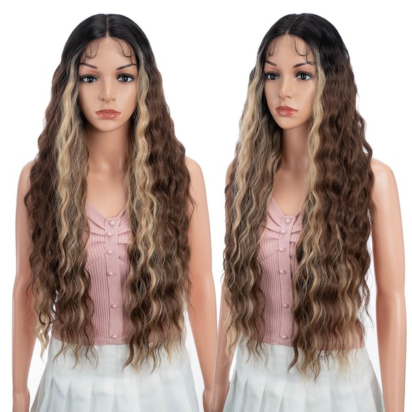 Joedir 30" Long Wavy Lace Front with 1.5"x4.5" Deep Part Lace Wig Heat Resistant Synthetic Wigs For Women 130% Density(Ombre Brown Highlights Color)