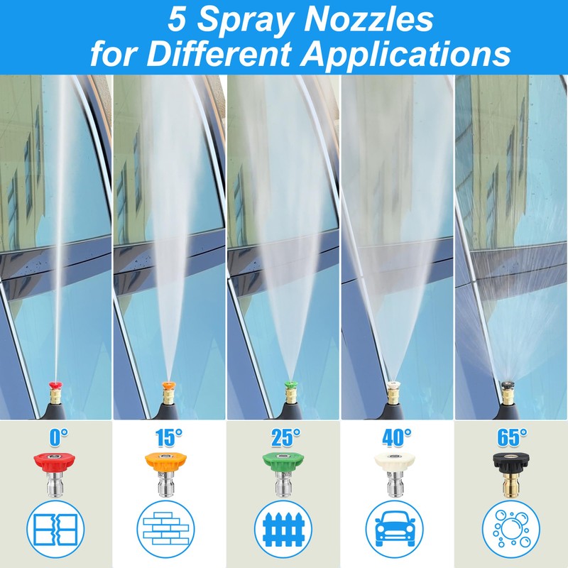 - 【Package Included】One pressure washer foam cannon, one power washer gun, five nozzle tips (max pressure: 4000 PSI, 2.5 GPM) with different spray angles: one Red 0° Nozzle Tip (Stainless Steel), one Yellow 15° Nozzle Tip ( Stainless Steel), one Green 25° Nozzle Tip (Stainless Steel), one White 40° Nozzle Tip (Stainless Steel), one Black Soap Nozzle Tip (Brass, 65°).