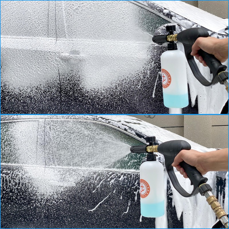 - 【Adjustable Snow Foam Lance】Rotate the spray nozzle to achieve your desired spray pattern (from narrow to wide). The water regulator knob on top allows you to control the mixing ratio of water and foam. Turn the knob according to your need, the minus sign(-) signifies less water (more foam), while the plus sign(+) indicates more water (less foam).