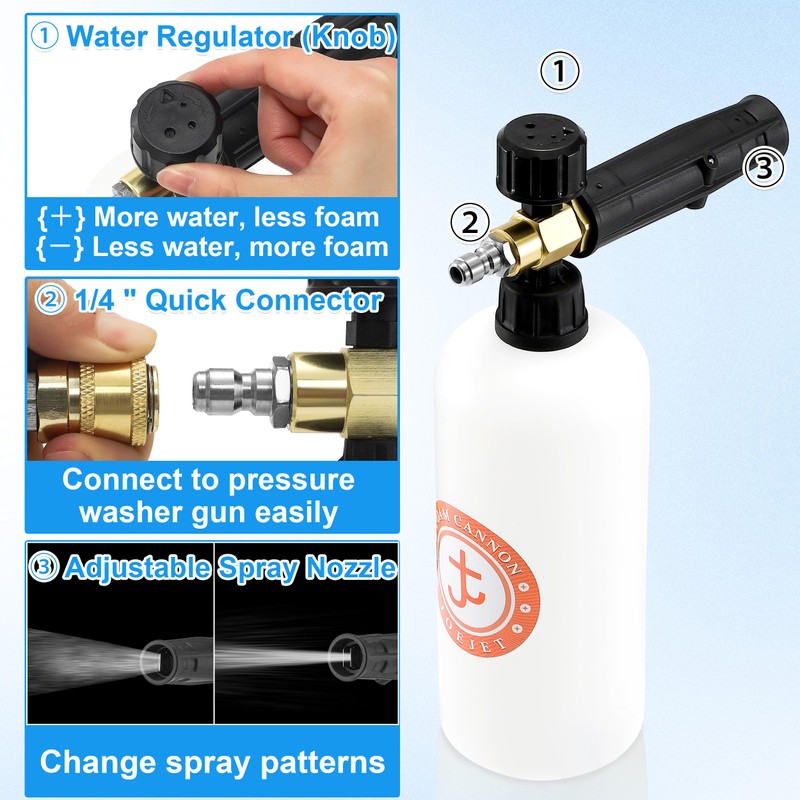 - 【Easy to Use】Connecting the foam cannon to the power washer gun is a breeze with 1/4 inch quick connector, ensuring a secure fit without leaks. Effortlessly adjust the spray pattern and foam concentration by rotating the corresponding parts, saving you time and energy. The comfortable handle of the gun reduces hand fatigue, and the safety trigger lock ensures controlled operation, preventing accidental spraying.