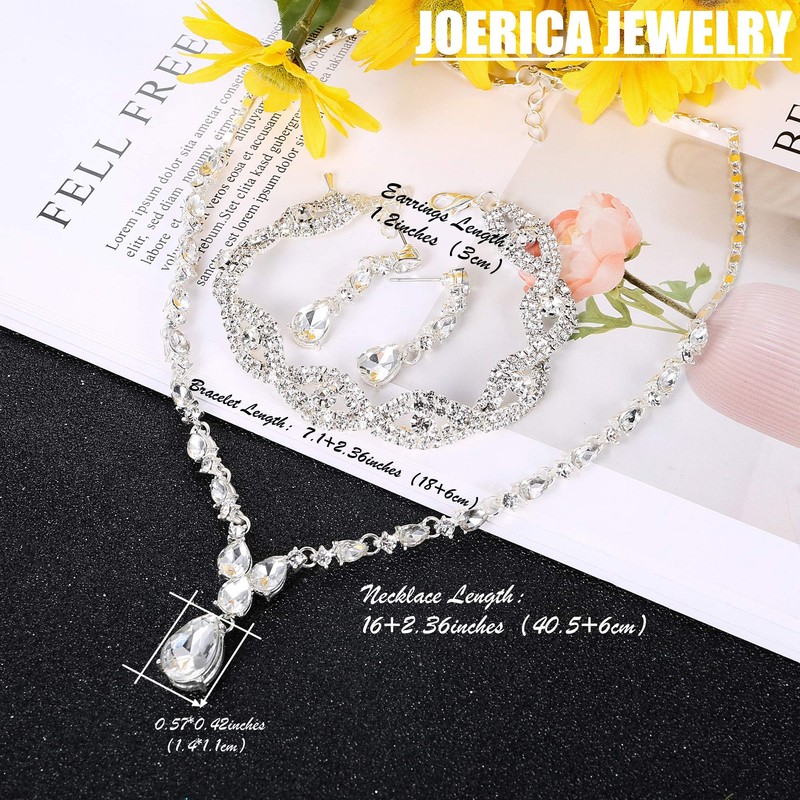 JOERCIA Silver Bridal Jewelry Set Rhinestone Necklace Bracelet Dangle Earrings for Bride Bridesmaid Teardrop Pendant Crystal Wedding Prom Jewelry Set for Women