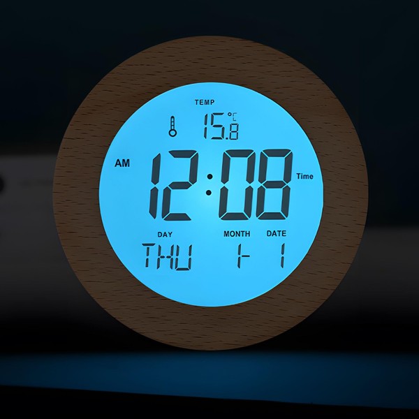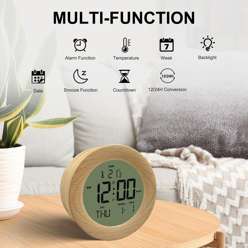 - ๐๐ฎ๐ฅ๐ญ๐ข๐๐ฎ๐ง๐๐ญ๐ข๐จ๐ง๐๐ฅ ๐๐ฅ๐๐ซ๐ฆ ๐๐ฅ๐จ๐๐ค: The JoFomp exquisite 4" round solid wooden digital alarm clocks for bedrooms features a clear LCD display and a backlight function, make the digital desk clock more distinctive. This wooden clock offers a variety of features: time, date, week, temperature (โ/โ), alarm, snooze, countdown, 12/24H, and backlight. The wood alarm clock's classic design combined with modern technology makes it an ideal choice for bedrooms, living rooms, kitchens and offices.