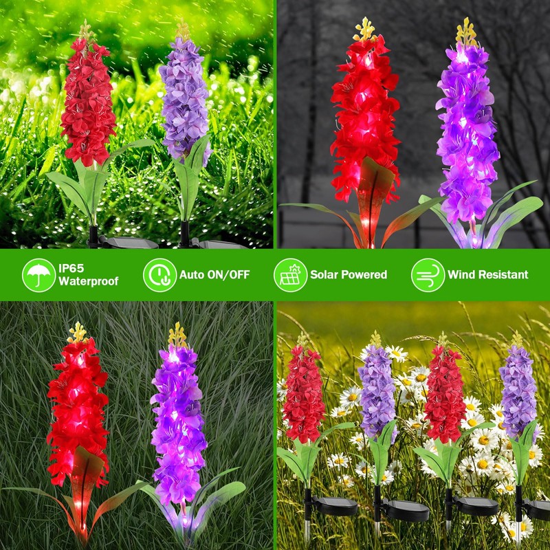 - What's in Your Package: You will get 2 solar garden lights in red and purple colors. Each dominant has 20 LED lights, more lights to make the petals brighter and more attractive.