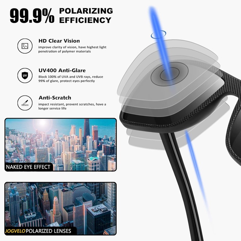 - HD polarisierte Gläser: Alle polarisierten Sonnenbrillen von JOGVELO sind mit hochwertigen polarisierten Gläsern mit UV-Schutz ausgestattet. TAC-Gläser stellen die wahre Farbe wieder her und reduzieren Augenschäden durch UVA, UVB und helles Licht. Hilft Ihnen, Ablenkungen und vorübergehende Blindheit durch Blendung zu vermeiden, und hilft Ihnen auch, hellere Szenen und lebendigere Farben klarer zu sehen.
