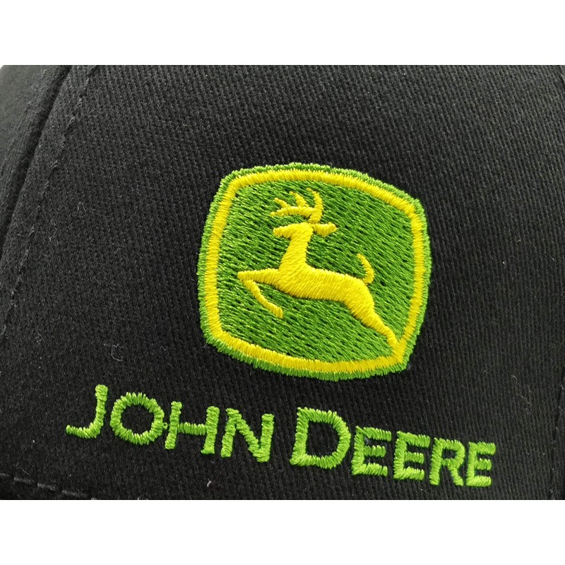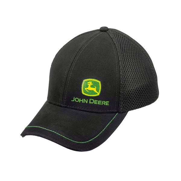 - A black John Deere fabric mesh cap with embroidered John Deere logo