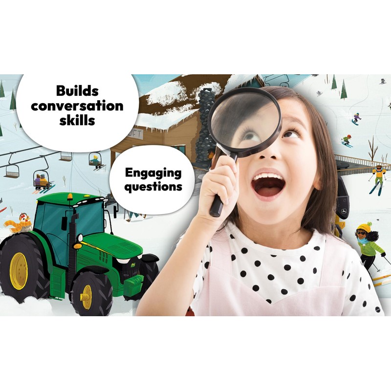- Lively rhyming and educational this John Deere Kids book asks "I Spy" questions to help engage kids further into the story for an interactive experience.|Practice early learning concepts such as counting colors and matching in every picture activity. | Engaging questions and new vocabulary words found on every page designed to help build conversation skills and support language development.| Designed for all age levels as a nice introduction to look search and find books preschoolers and toddlers will have fun with guided questions by an adult while boys and girls able to read will have fun guiding themselves through the activities.| At-home or on-the-go read is ideal for road trips airplane rides tractor rides rainy days and more!