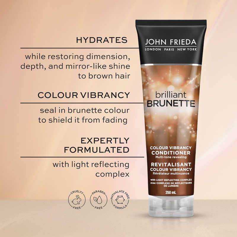 - Boost your brunette with John Frieda Brilliant Brunette Colour Vibrancy Conditioner— perfect for restoring dimension, depth, and mirror-like shine to brown hair.