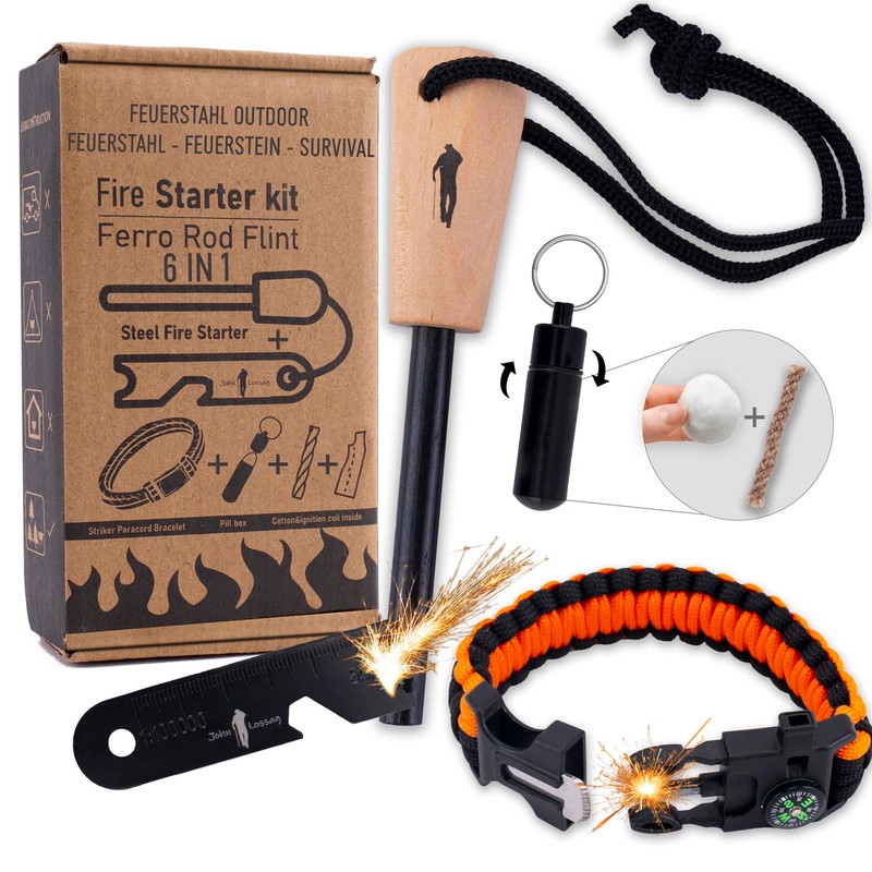 John Lossag - Fire Steel Outdoor Set - Flint, Kienspan, Survival Equipment for Camping
