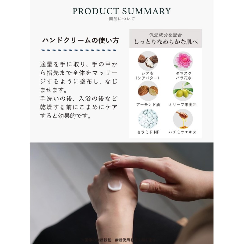 Hand cream with a smooth texture that is resistant to stickiness. The thick cream blends beautifully with naturally smooth hands and skin.