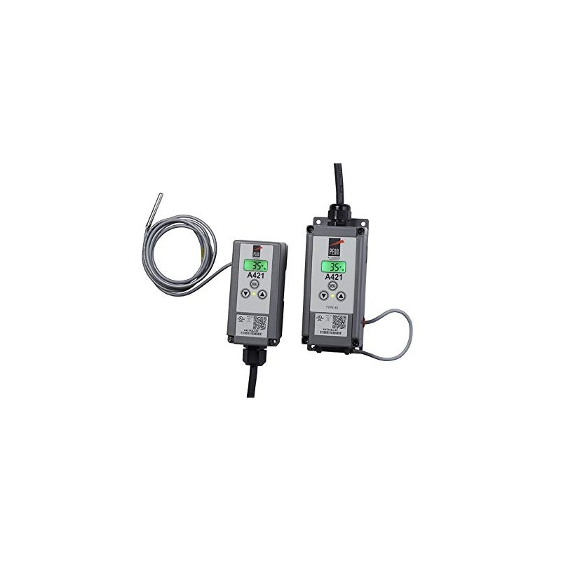 The A421 Series Electronic Temperature Controls are single-stage controls with a single-pole, double-throw (SPDT) output relay, a bright backlit LCD, and a three-button touchpad interface that can be set up to restrict user adjustments. An LED indicates the output relay's On/Off status. The A421 Series Controls have simple On and Off temperature settings for heating or cooling, an adjustable anti-short cycle delay, and a temperature offset function. The control range is -40 to 212°F (-40 to 100°C) for standard models. Models with a control range of -40 to 248°F (-40 to 120°C) are available in quantity orders. The controls feature remote sensing capability and interchangeable sensors. The A421 Controls are available in either Type 1 (NEMA)/IP20 high-impact plastic enclosure suitable for surface or DIN rail mounting or Type 4X (NEMA)/IP66 watertight, corrosion-resistant surface mount enclosures. A421 Controls with Off-Cycle Defrost (A421ABD and A421AED models) provide off-cycle defrost control with user-configurable defrost cycle duration and frequency.