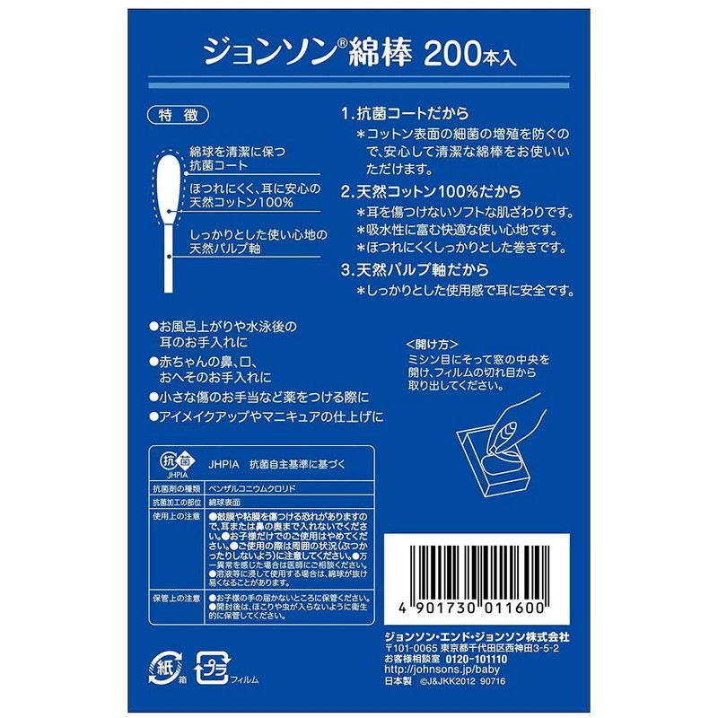 - Made of 100% carefully selected natural cotton swabs with a soft touch antibacterial coating to prevent the growth of bacteria on the cotton surface. *Does not inhibit the growth of all bacteria. The shaft is made of natural pulp with a firm feel