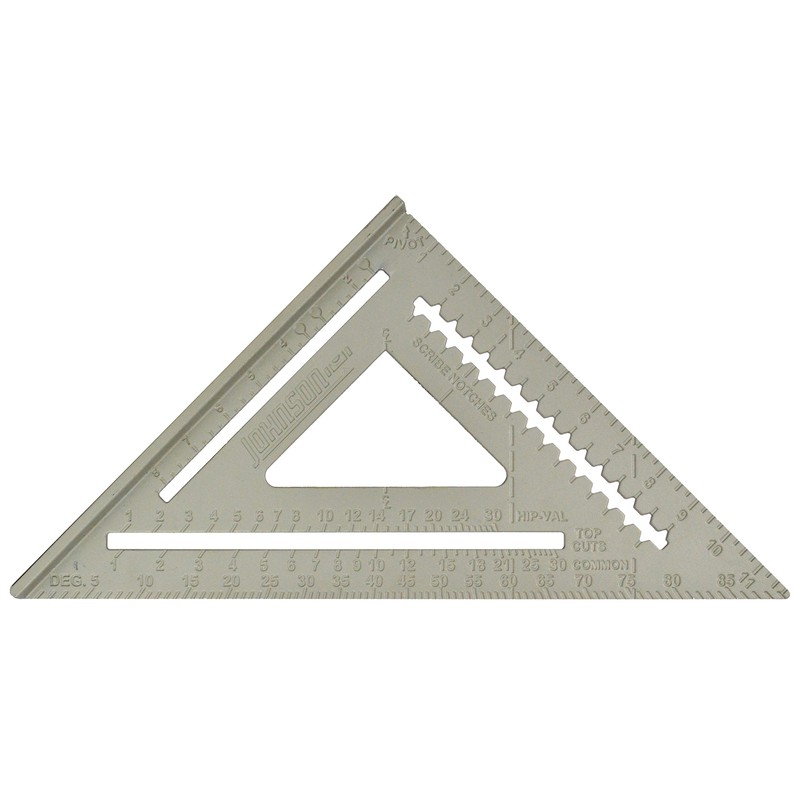As a saw guide, Stair layout tool or rafter tool, johnson's 12" Rafter square will help you get the job done accurately and easily. Its solid aluminum body construction with CNC machined edges provide greater accuracy and durability, while the Low-glare, protective powder-coated finish makes the permanent graduations and numbers easy to read. This square also features scribe notches starting at 1-3/4" That are useful when transferring outside increments from the Pivot point, and handy Markers that measure 2x4 board Dimensions of 1-1/2", 3" And 3-1/2".