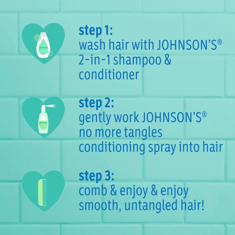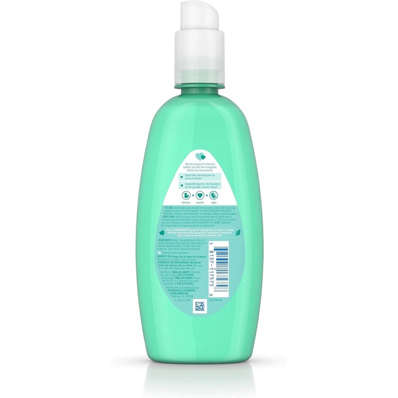 Tame tangles and snarls while making hair more manageable with Johnson's Buddies No More Tangles Detangler. Designed for use on wet or dry hair, this spray works on contact to loosen knots, so combing is easier. The gentle Johnson's No More Tears formula won't irritate eyes and requires no rinsing.