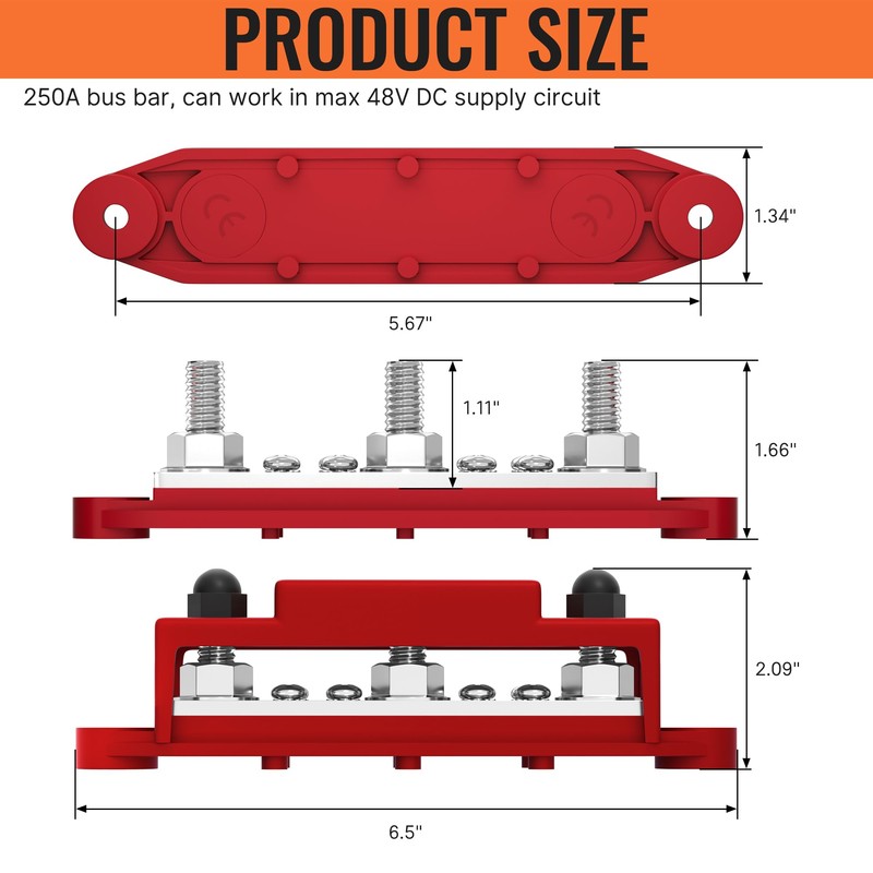 - 250A Rating: The battery distribution block rated 250A when work in 12v supplier circuit, and the battery terminal block can handle MAX 48V source power