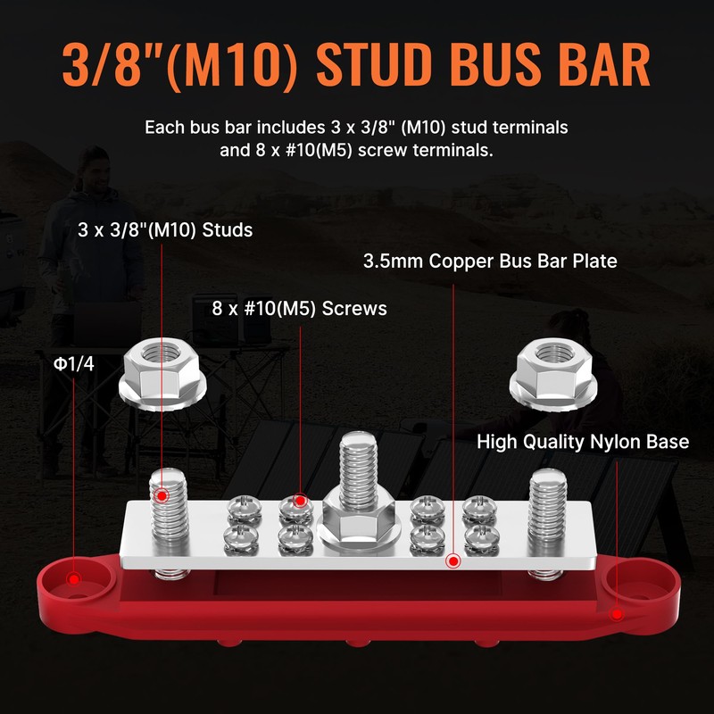 - 3/8" Stud: The battery bus bar terminal block includes 3 x 3/8"(M10) studs and 8 x #10(M5) screw terminals, our 12v bus bar also features 3.5mm thicker copper bus bar plate which can be connected to wider range of cables.