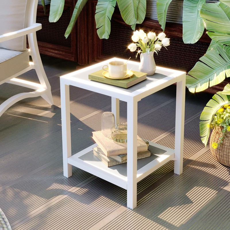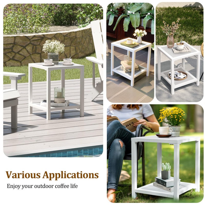 JOINHOM Outdoor Side Table, End Table for Patio,15.8" Solid Side Table for Pool, 2-Tier Sturdy and Weather Resistant, Backyard & Lawn, White