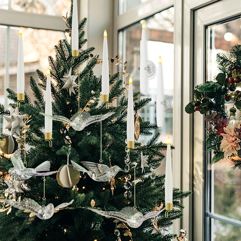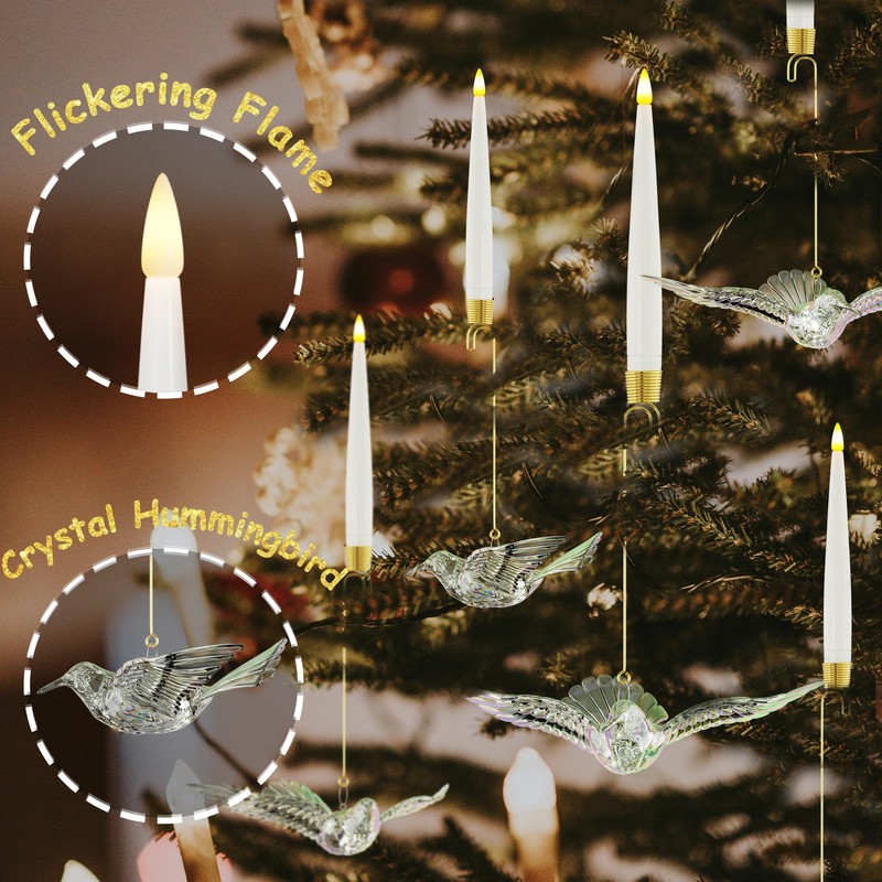 - Crystal Hummingbird Hook & 3D Flame - Each Christmas tree taper candles has a unique hook decorated with Crystal Hummingbird Christmas elements, adding a touch of winter atmosphere to your Christmas tree decorations. Enhance the beauty of the tree with its 3D flame and realistic flickering effect, creating a warm, cozy glow