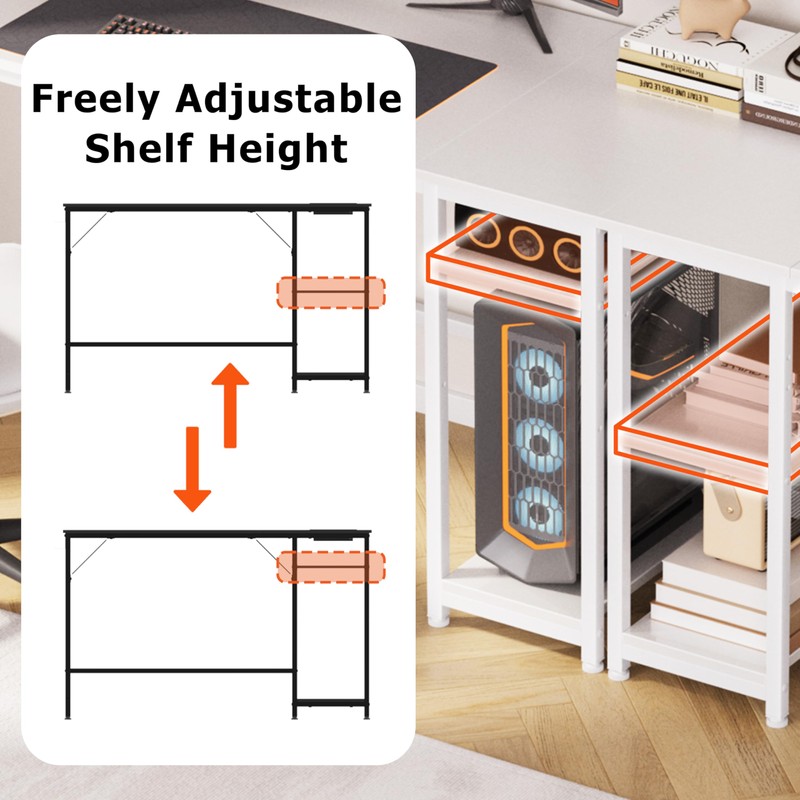 - 【Adjustable Storage】 The adjustable open storage shelf of the office desk can be placed on the left or right side. The storage shelf can be adjusted in three sections to hold the computer mainframe and books.