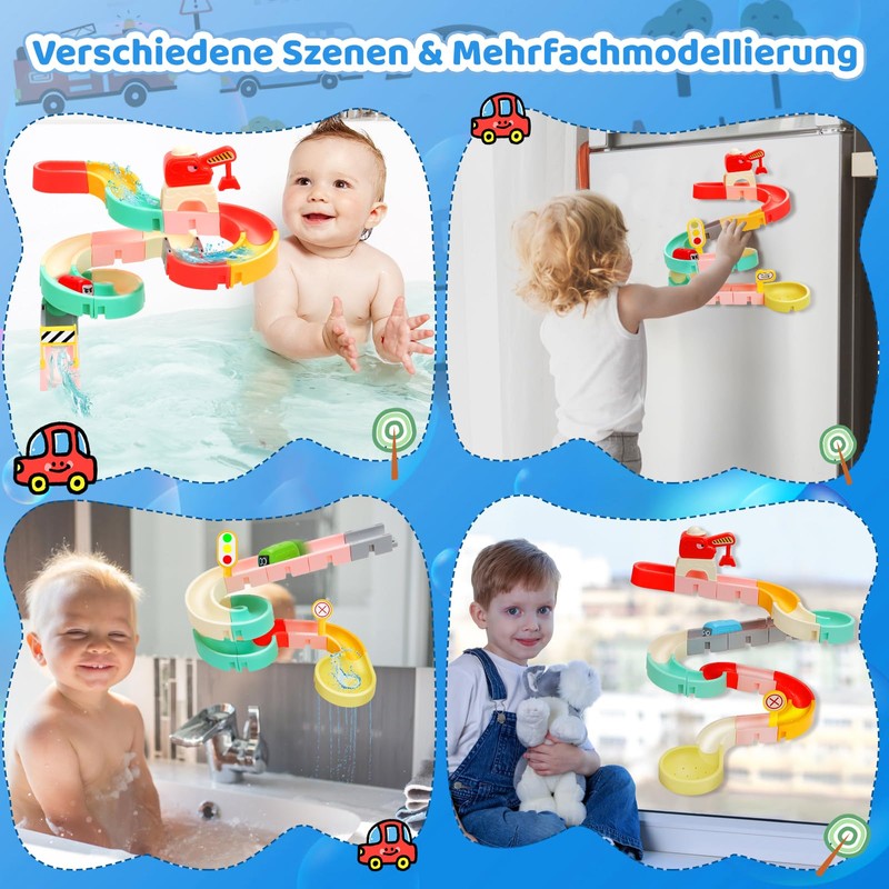 - Creative bath time: bath toy set includes 37 pieces (including colourful parts, suction cups, slide cars, crane, rail accessories, etc.). Children can design freely curved or straight tracks in all directions and let the cars slide on the self-designed tracks - making bathing a pleasure!