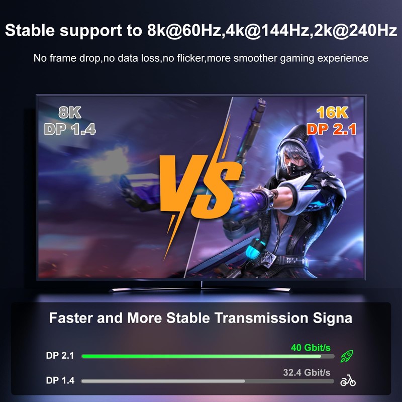 • Enhanced Gaming Experience: The DisplayPort 2.1 Cable provides higher bandwidth, HBR3 supports 32.4 Gbps of bandwidth; High refresh rate and high resolution, Maximize the performance of your graphics card and monitor; No motion blur, screen tearing or flickering; Dynamic HDR can optimize the game's dark picture and enhance the detail