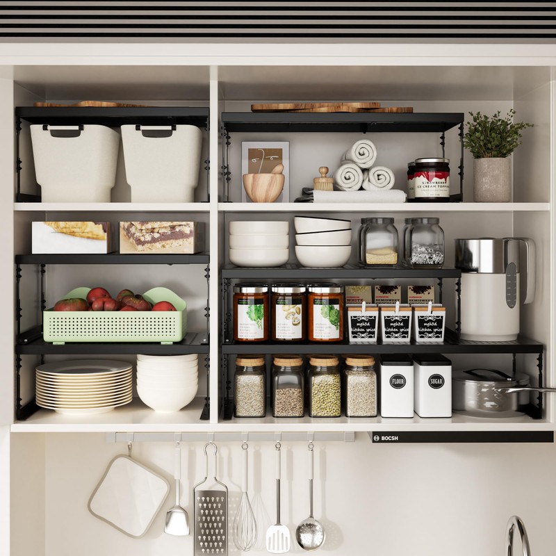 - Stackable & Expandable Flexibility: This metal shelf features an adjustable height ranging from 6.7 inches to 8.6 inches and a width that can be extended from 15.95 inches to 27.2 inches. This adaptability allows it to fit perfectly into various spaces. Moreover, multiple units can be stacked vertically, significantly increasing your storage capacity and making the most of available room.