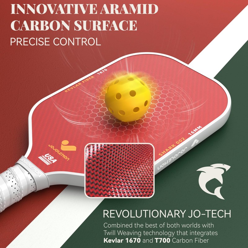 - INNOVATIVE HYBRID ARAMID SURFACE: The SHARK 002 pickleball paddle combines Kevlar 1670 and T700 Carbon Fiber materials, providing outstanding spin for roll volleys and pinpoint control for finesse shots like dinking.