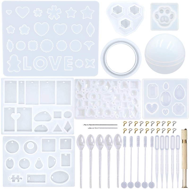 - 9 types jewelry silicone casting molds. The kit also includes accessories such as 5 plastic stirrer, 5 plastic dropper, 5 plastic spoon, 1 hand twist drill (include 2 pieces twist bits), 100 screw golden eye pins and 100 screw silver eye pins.