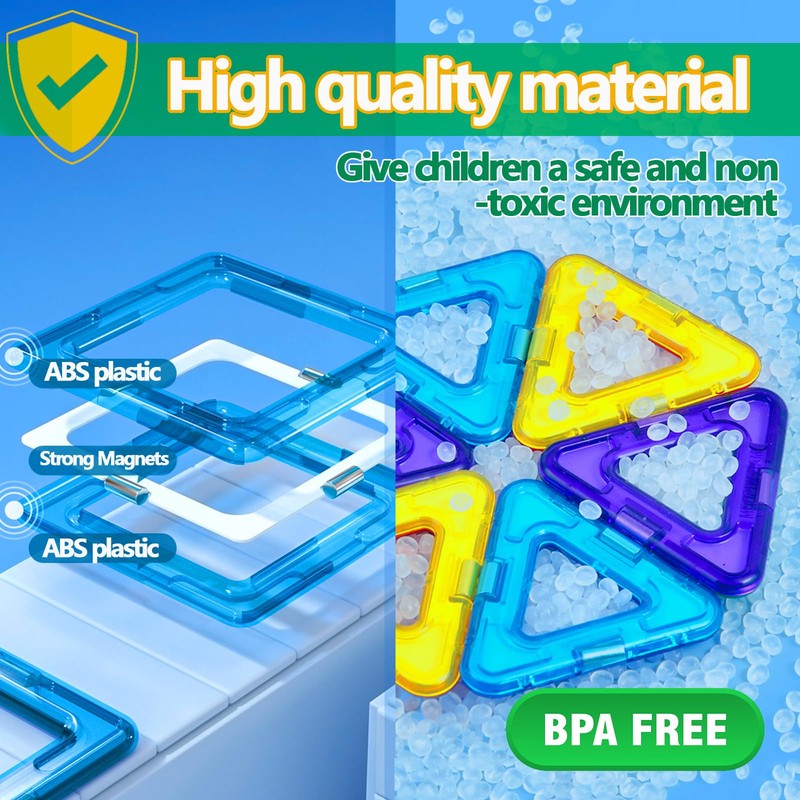 - High-quality ABS plastic material: Jokooan magnetic toy made of BPA-free, non-toxic food grade ABS plastic, drop-resistant and washable. The colours are pure and bright and attract children's attention. Soft rounded corners protect children's hands from injury. Meanwhile, our magnetic building block toys comply with CE, ASTM and EN71.