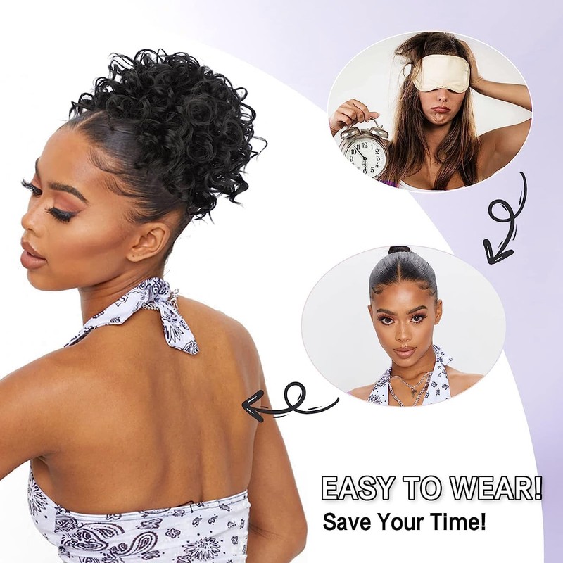 - Gorgeous Curls: This Afro drawstring ponytail is perfect for black women. It features a buckle drawstring and two hairpins to secure the curls. This curly ponytail is easy to install and maintains a fluffy, soft texture.